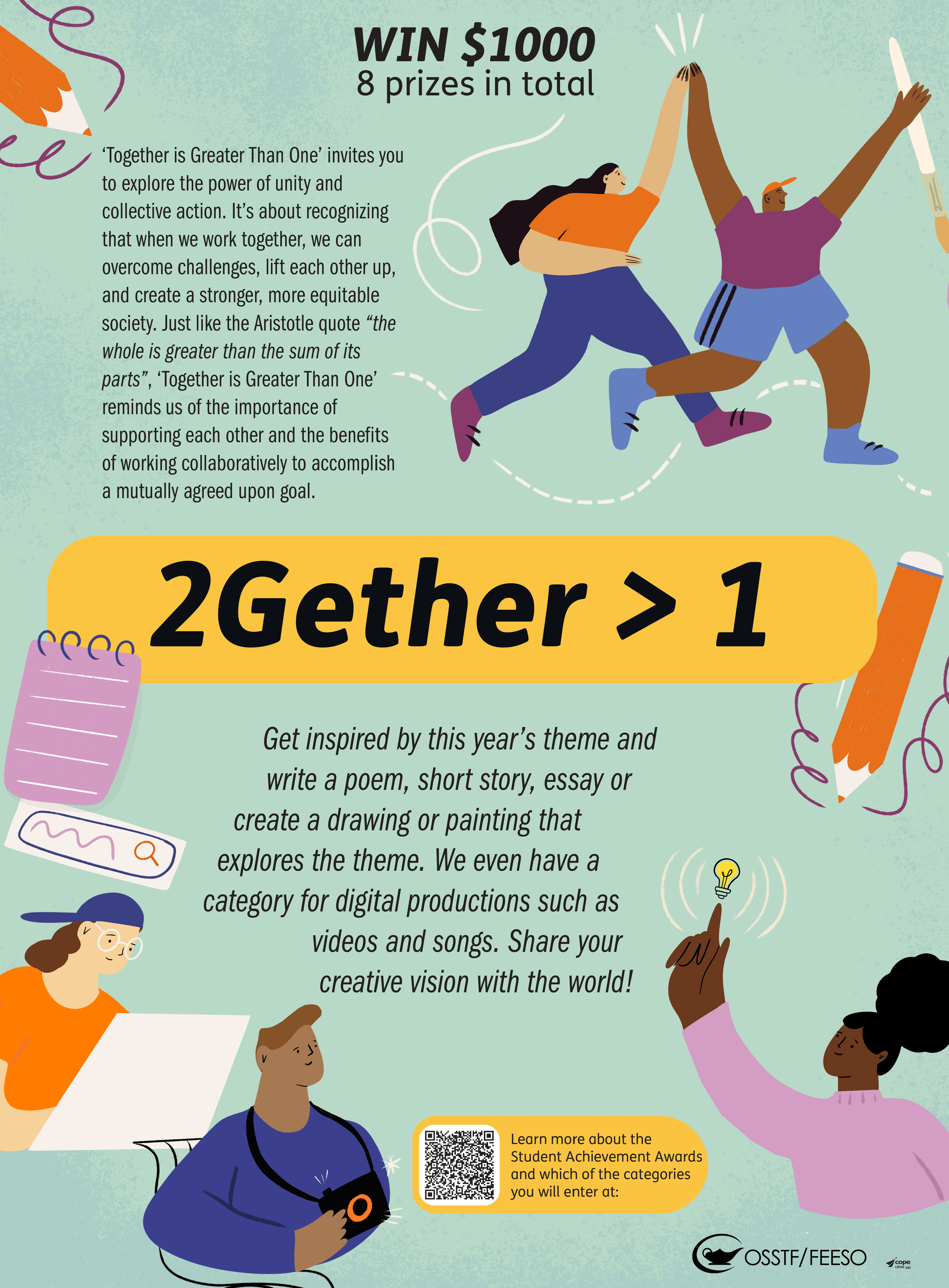 On March 9, 2024, the Ontario Secondary School Teachers' Federation (OSSTF/FEESO), celebrated the 2024 Student Achievement Award provincial winners. The 2024 theme – This Hits Different — The Power of Language, captured the students’ imaginations and inspired some truly amazing work. Nine provincial winners in nine categories, were awarded $1000 in each category for their prize.